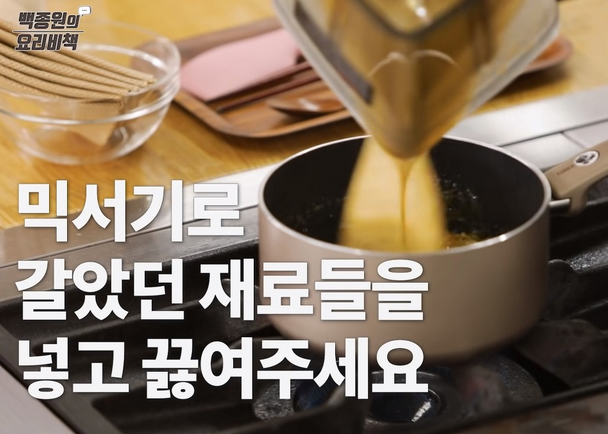 살짝 볶아졌다면 믹서기로 갈아놓았던 재료들을 넣고 함께 끓여주세요.